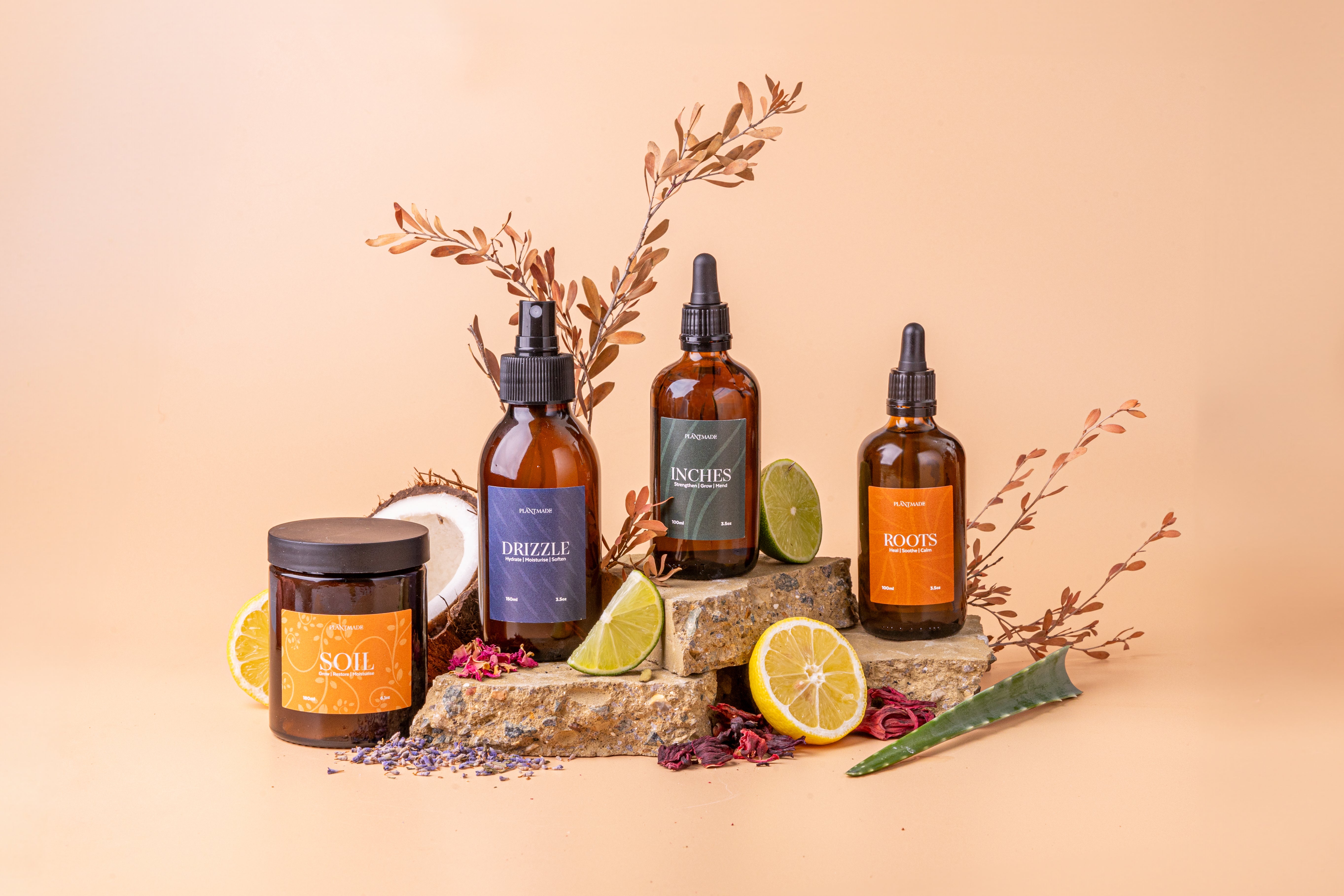 Helianthus Annuus (Sunflower) Oil, (Aloe Vera) Barbadensis Leaf Extract, Prunus Armeniaca (Apricot Kernel) Oil, Vitis Vinifera (Grapeseed) Oil, Azadirachta Indica Seed (Neem) Oil, Adansonia Digitata (Baobab) Seed Oil, (Moringa) Oleifera Seed Extract, Somnifera Root Extract (Ashwagandha), Phyllanthus Emblica Fruit Extract (Amla), Acacia Concinna Fruit Extract (Shikaki), Cymbopogon Citratus Leaf (Lemongrass) Oil, Melaleuca Alternafolia (Tea Tree) Oil, (Eucalyptus) Globulus Oil, Santalum Album Oil (Sandalwood), (Sabdariffa Flower) Hibiscus Flowers